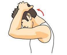 손을 앞으로 쭉 편 다음 두 손을 모아 깍지를 끼고 머리 위로 쭉 올려주는 동작입니다. 깍지를 낀 팔이 머리 뒤로 넘어간 상태에서 10~30초 정도 자세를 유지한 후 자세를 천천히 풀어주면 거북목 교정에 도움이 됩니다.