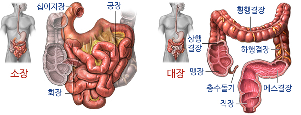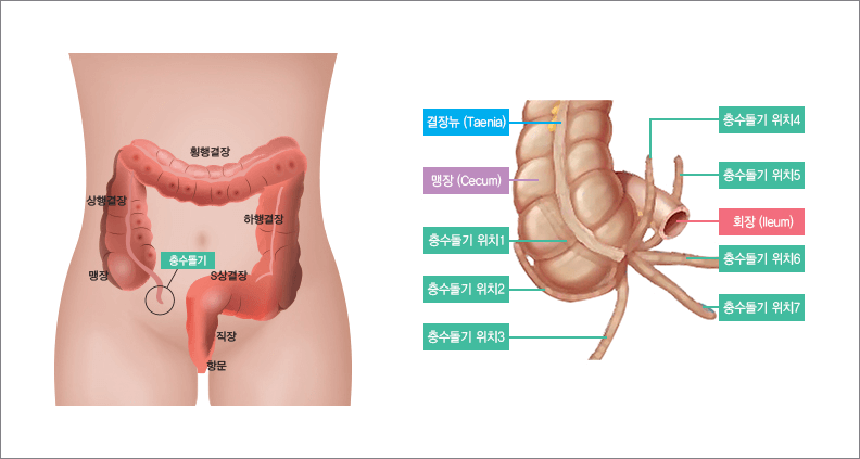 충수 (Appendix): 맹장의 일부분으로, 맹장과 맹장을 연결하는 부분에 작은 통로 형태로 붙어 있습니다. 인체에게 특별한 기능을 하는 것으로 알려져 있지 않지만, 염증이나 감염 등으로 인한 질환의 원인이 될 수 있습니다.