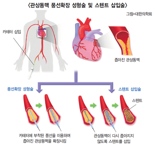 식생활과 생활 습관의 서구화로 최근 우리 나라에서는 동맥경화에 의한 심장 질환 및 뇌졸증이 암을 제치고 사망 원인의 상위를 차지하고 있습니다. 동맥경화성 심장병의 대표 질환이 바로 심근경색증과 협심증인데, 두 질환 모두 심장에 산소와 영양분을 공급하는 관동맥이 막히거나 좁아져서 생깁니다. 심근경색증은 관동맥이 완전히 막힘으로써 그 혈관이 영양하는 심장근육이 손상을 입는 상태를 말합니다.