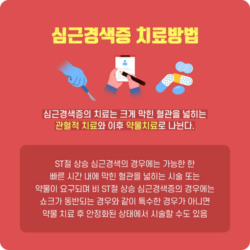 심근경색증으로 진단된다면 어느 병원, 어느 의사라도 초를 다투는 치료를 시작합니다. 치료 방법은 각 병원이 처한 환경에 따라 조금씩 다릅니다. 혈전을 녹이는 약물치료를 우선하기도 하고, 바로 관상동맥을 확장하는 시술로 들어갈 수도 있습니다. 어느 치료 방법이든지 가장 빠른 시간 안에 막혀 있는 관상동맥을 다시 열어주는 것이 치료의 핵심입니다. 관상동맥이 완전히 막히면 2시간 이내에 열어주어야 심근 손상이 발생하지 않으며, 적어도 12시간 이내에 치료해야 큰 합병증이 발생하지 않습니다.