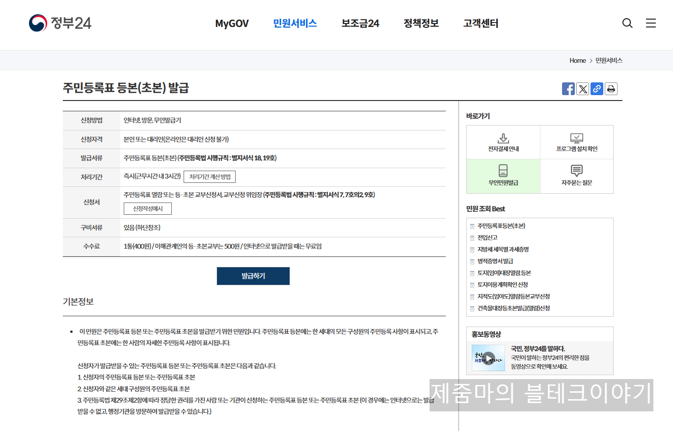 정부24 사이트에 들어가 주민등록등본(초본)을 클릭하세요.