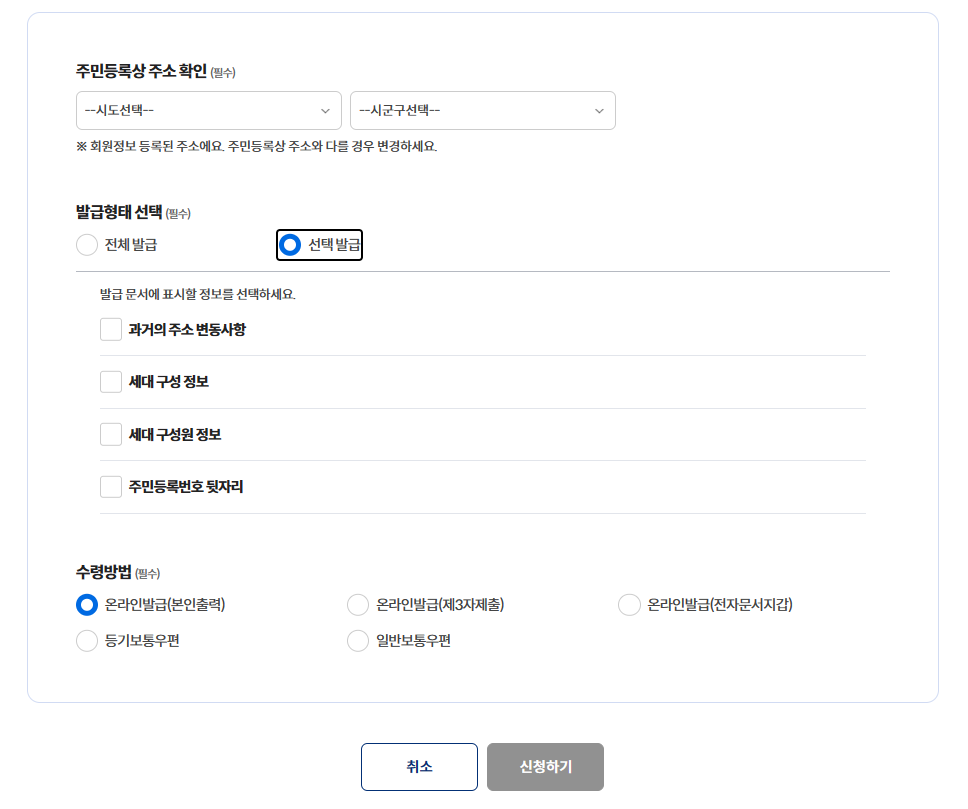 로그인 후 발급화면으로 넘어오면 원하는 서비스 유형 및 주민등록상 주소, 발급형태와 수령방법까지 선택한 후 신청하기를 누르시면 됩니다.