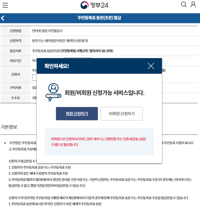 등본(초본) 발급 메뉴에 들어가 <발급하기>를 클릭하면 회원/비회원 신청가능 서비스라고 뜨게됩니다.